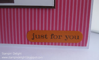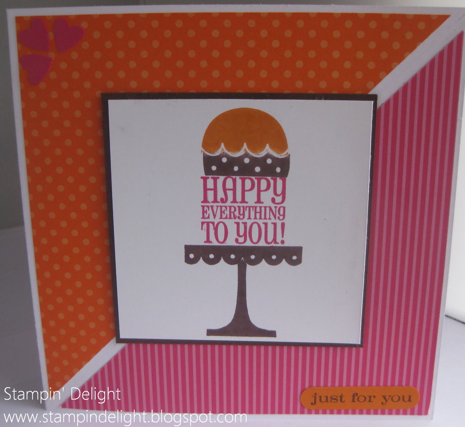 I used the gorgeous papers from the Brights stack in Melon Mambo and Pumpkin Pie to create the background. The image is stamped from On a Pedestal in the colour combo together with Chocolate Chip – perfect for a cake I think. (he he …. oops no more I promise!) The image was so easy to do with a Stamp-ma-jig and you can create a cake with as many layers as you want. The hearts were punched out with the mini heart punch and the sentiment is from Just Believe and punched with the Word Window.