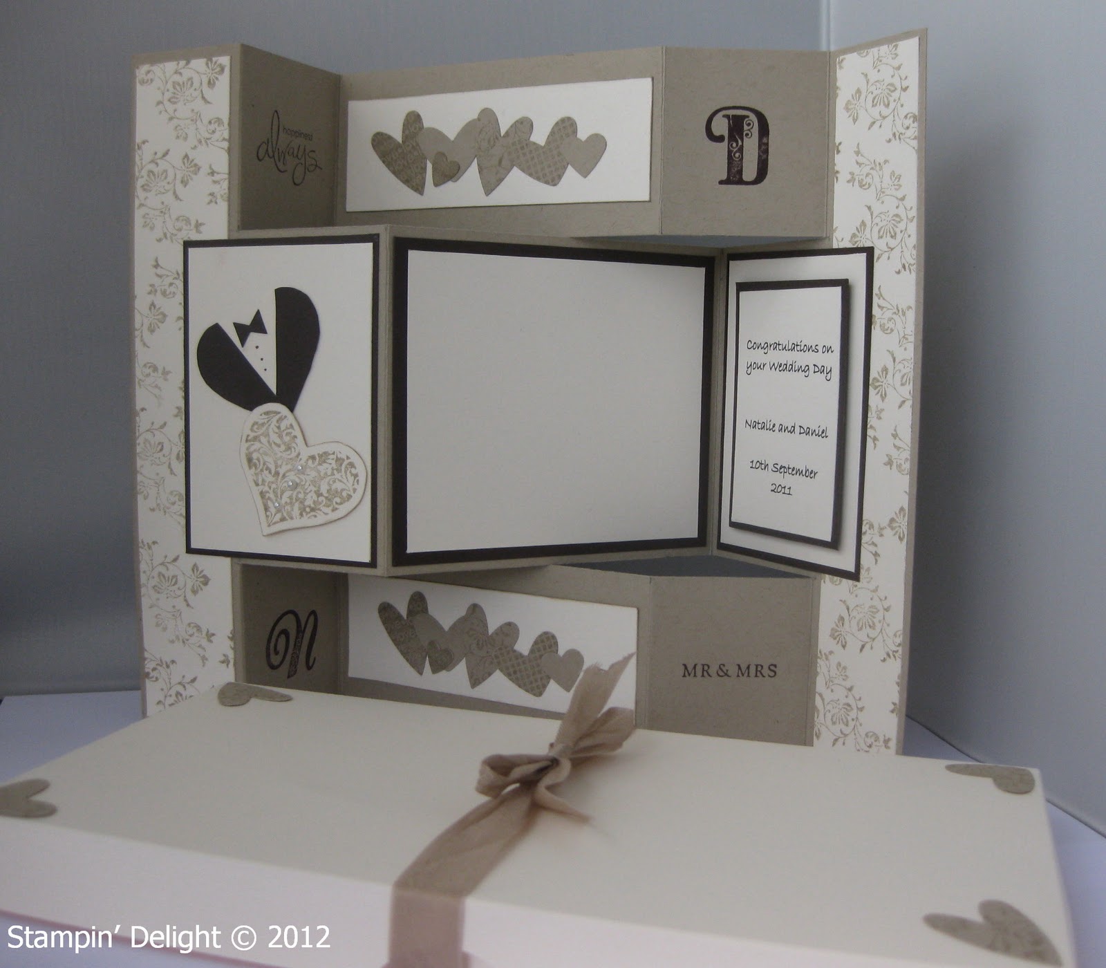 I finished the card with a message printed off on the computer and a couple of now retired sentiments together with couple’s initials from the Broadsheet Alphabet Stamp. Perfectly personalised! I completed the card with a matching gift box – there was no way this card was going in an envelope.