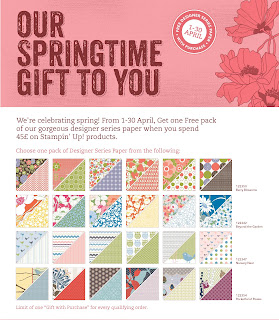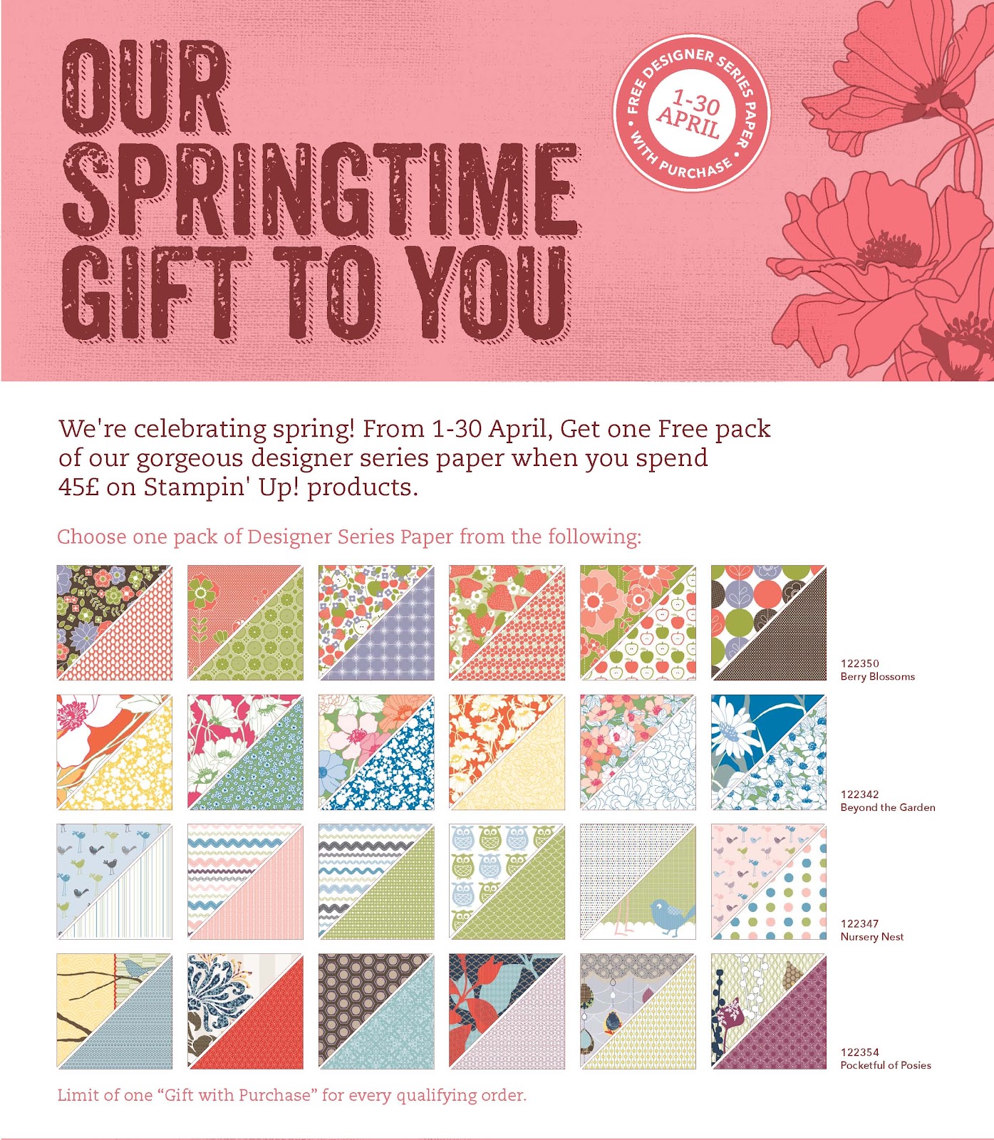 Just a quick post from me today! As always it’s a sad moment when Sale-a-bration ends, but Stampin’ Up! know how to cheer us up …. with another fantastic promotion. During April if you spend £45 in one transaction you can earn FREE Designer Papers.
