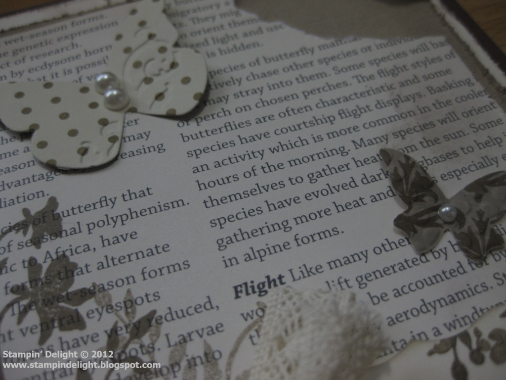 The text on the paper is all about butterflies so I decided to add some stamped foliage from the Just Believe stamp set in Soft Suede and a few embossed butterflies from the oh-so gorgeous Mocha Morning designer papers.