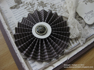 The whole card started with my desire to have a go at making one of the rosettes I have seen in blogland. I had a 12″ strip of Chocolate Chip DSP in my ever growing scrap box and set to creating the rosette. With the new Simply Scored tool we now have – from the Summer Mini – creating these rosettes is super quick and easy. I used a small circle of very vanilla and one of the antique brads to finish it off. I love these brads and you can only see how gorgeous they are when you see them in real life.