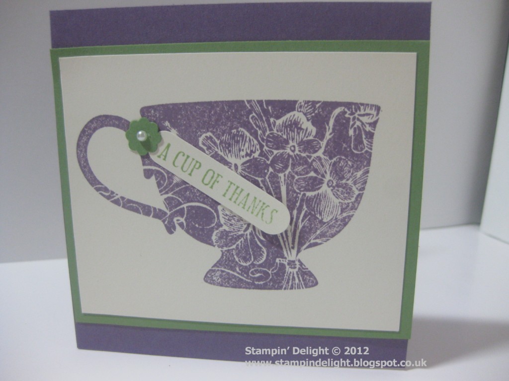 I used a colour combination of Perfect Plum and Wisteria wonder. The large cup was simply stamped onto Very Vanilla cardstock and then I added the sentiment using my slightly overused Word Window Punch! (it’s just too perfect for sentiments ;-))